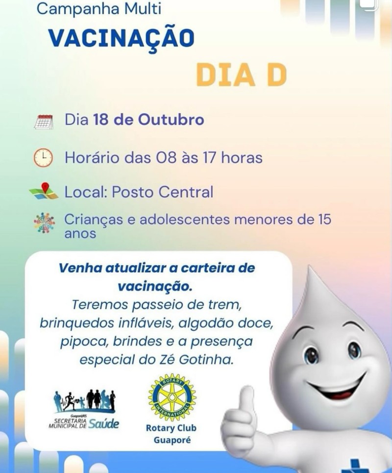 A Administração Municipal, por meio da Secretaria Municipal de Saúde, em parceria com o Rotary Club de Guaporé, promoverá no sábado, dia 18 de outubro, das 8h às 17h, no Centro Municipal de Saúde (Posto Central), o “Dia D de Multivacinação – Saúde, Alegria e Cidadania”. A ação tem como principal objetivo atualizar as cadernetas de vacinação de crianças e adolescentes menores de 15 anos, garantindo a proteção contra diversas doenças e reforçando a importância da imunização para a saúde pública.